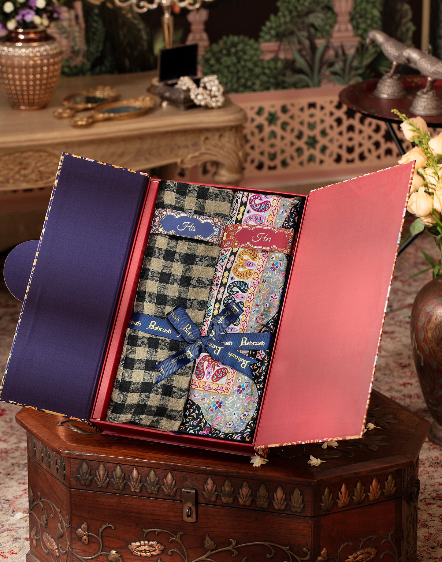 Pashtush His And Her Set Of Mens Fine Wool Stole and Womens Bamboo Stole, Premium Gift Box Packaging, Black and Multicolour