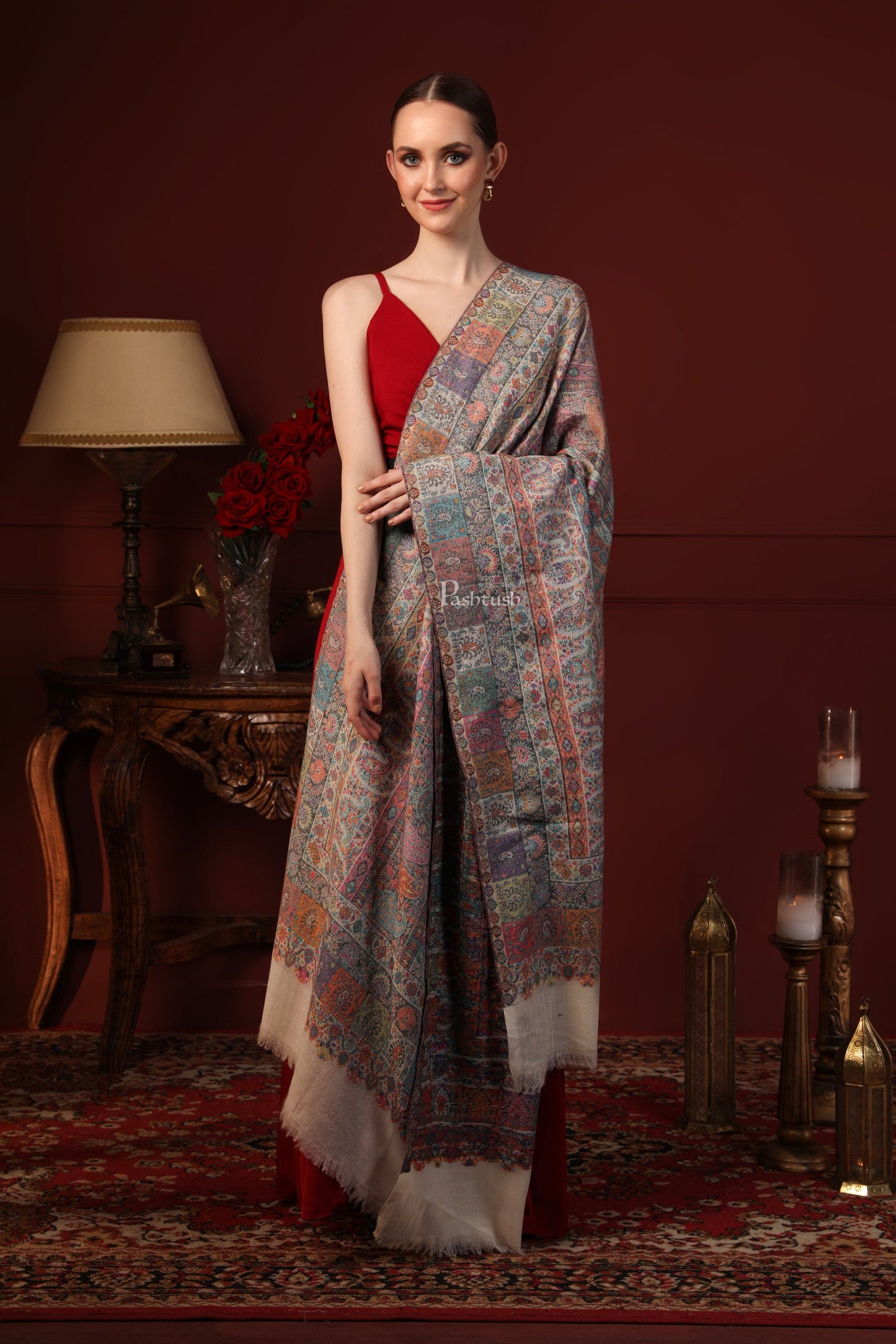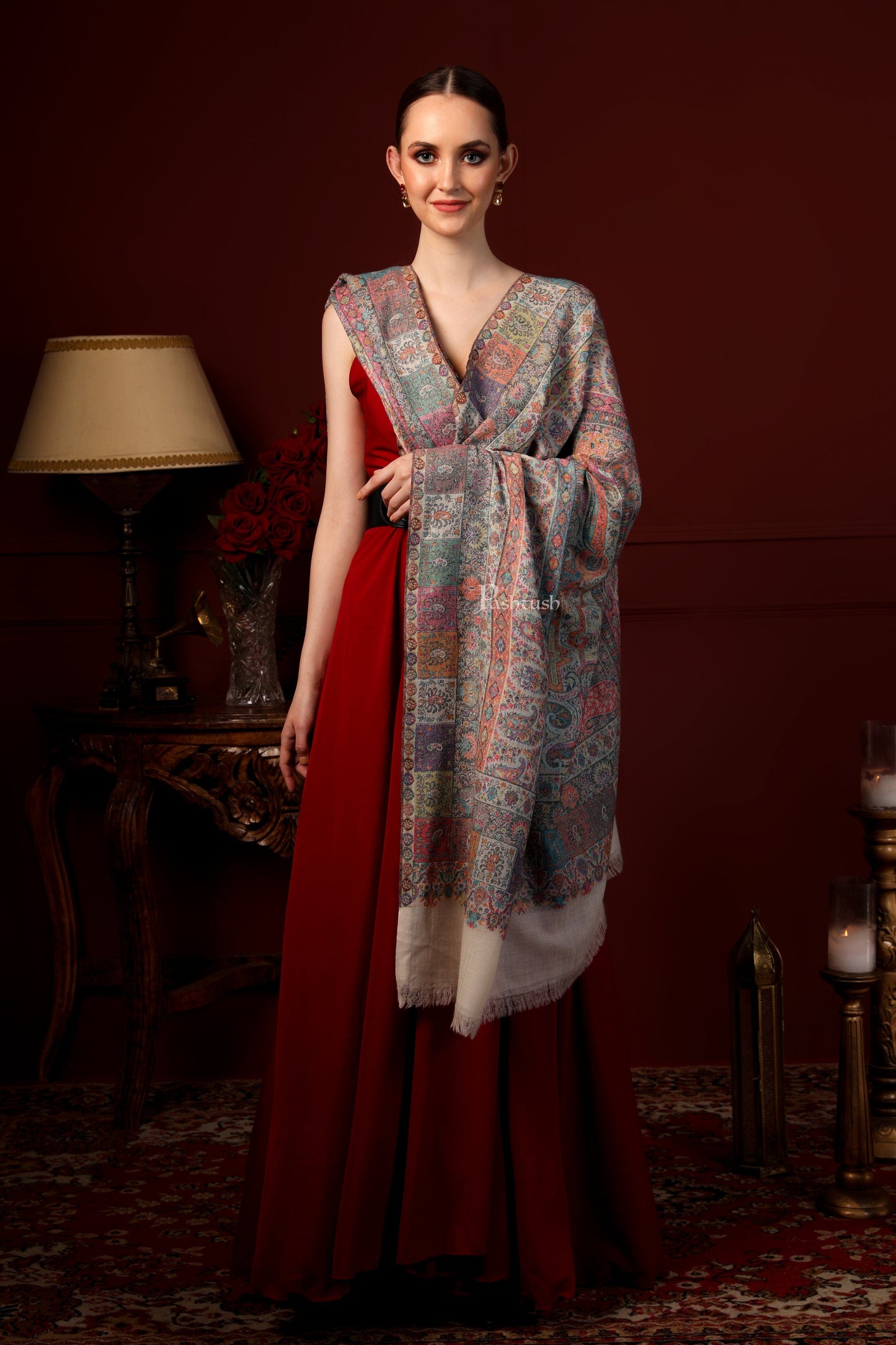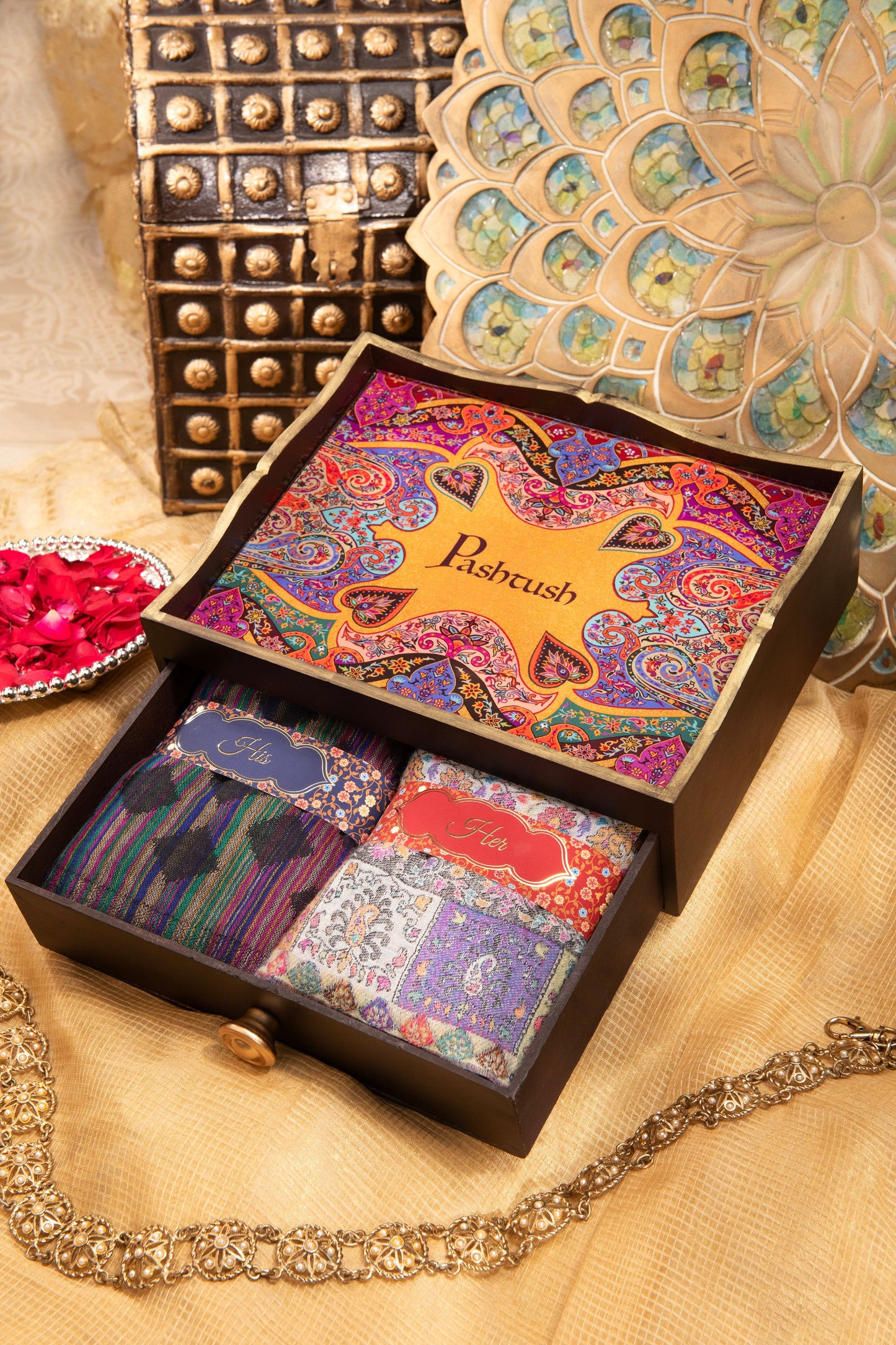 Pashtush His And Her Set Of Reversible Pure Wool Stole and Pure Ethnic Weave Shawl With Wooden Chester Box, Multi Colour
