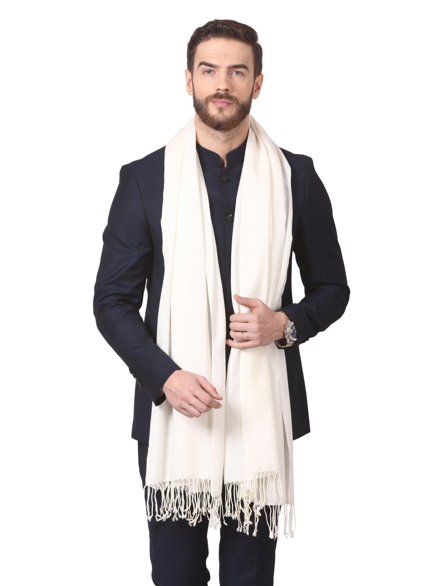 Pashtush His And Her Set Of Self and Bamboo Print Stoles With Premium Gift Box Packaging, Ivory and Multi Colour