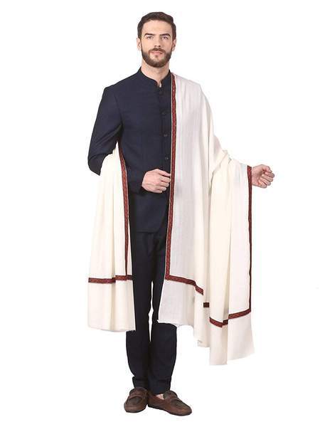 Pashtush Mens Border Embroidery Mens Shawl With Handwork In White