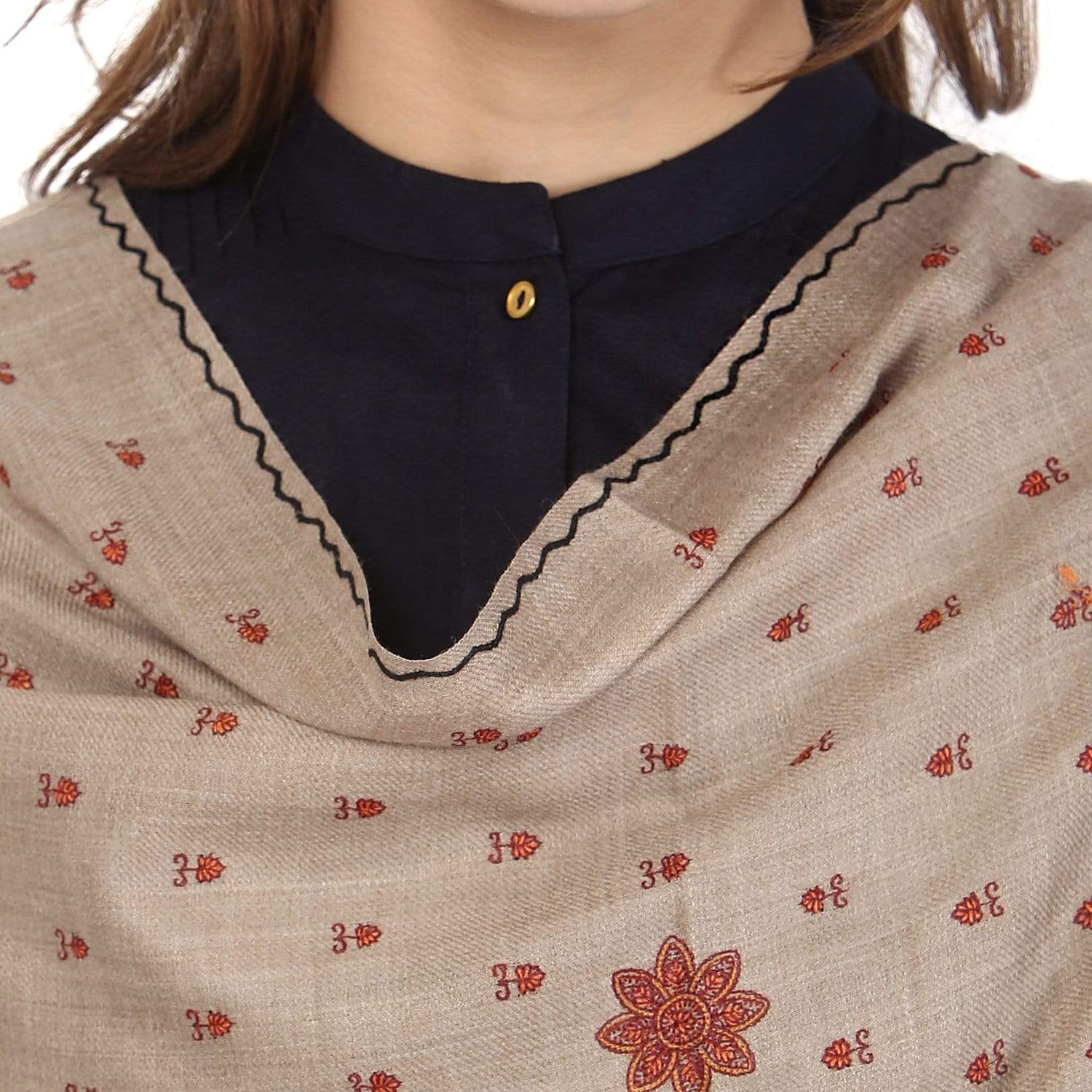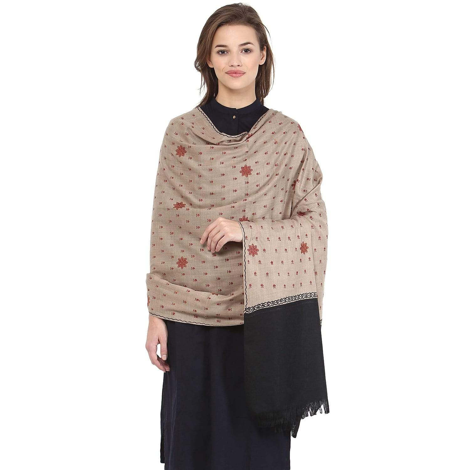 Pashtush Women'S Embroidery Wool Shawl, Beige And Black, Design Shawl