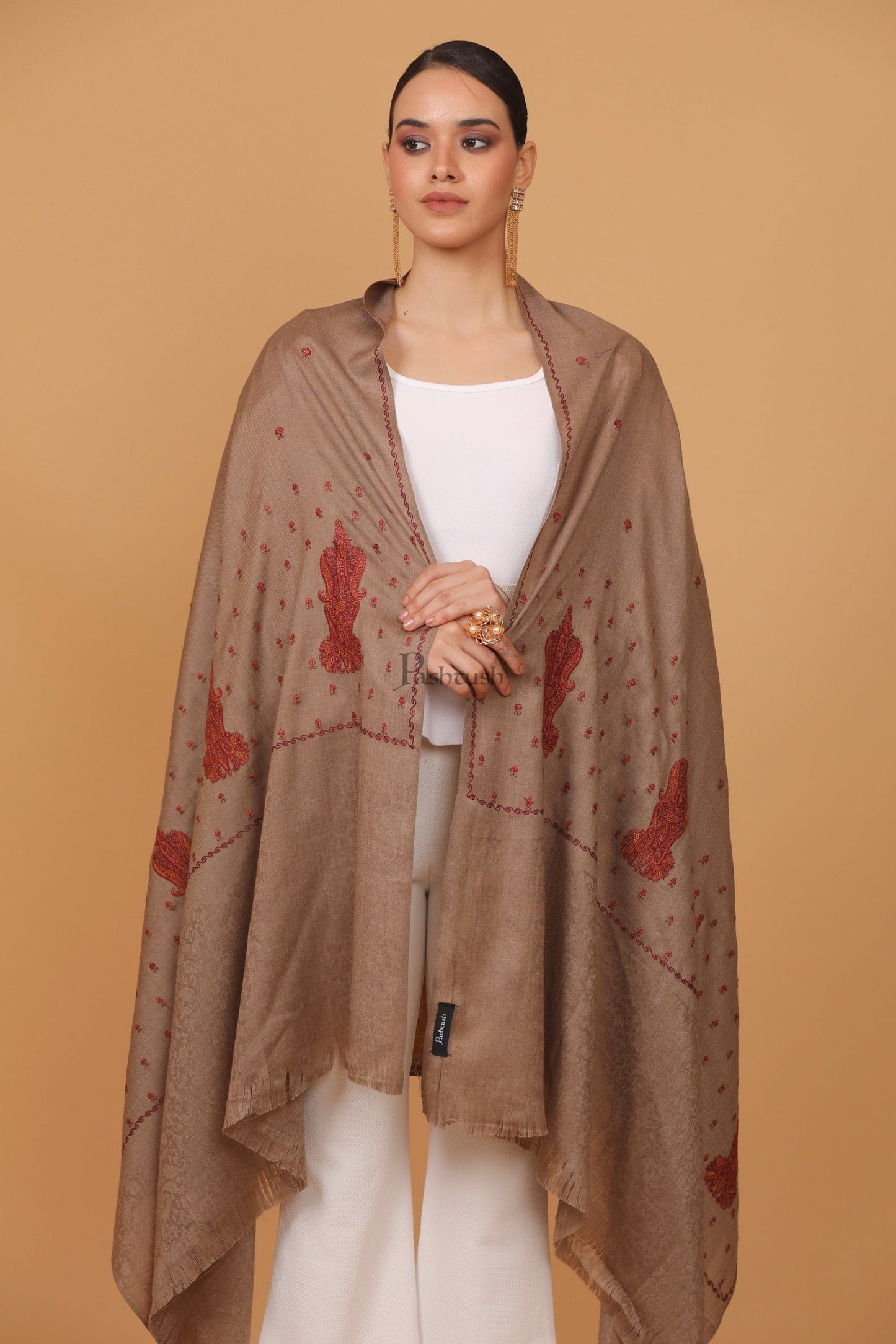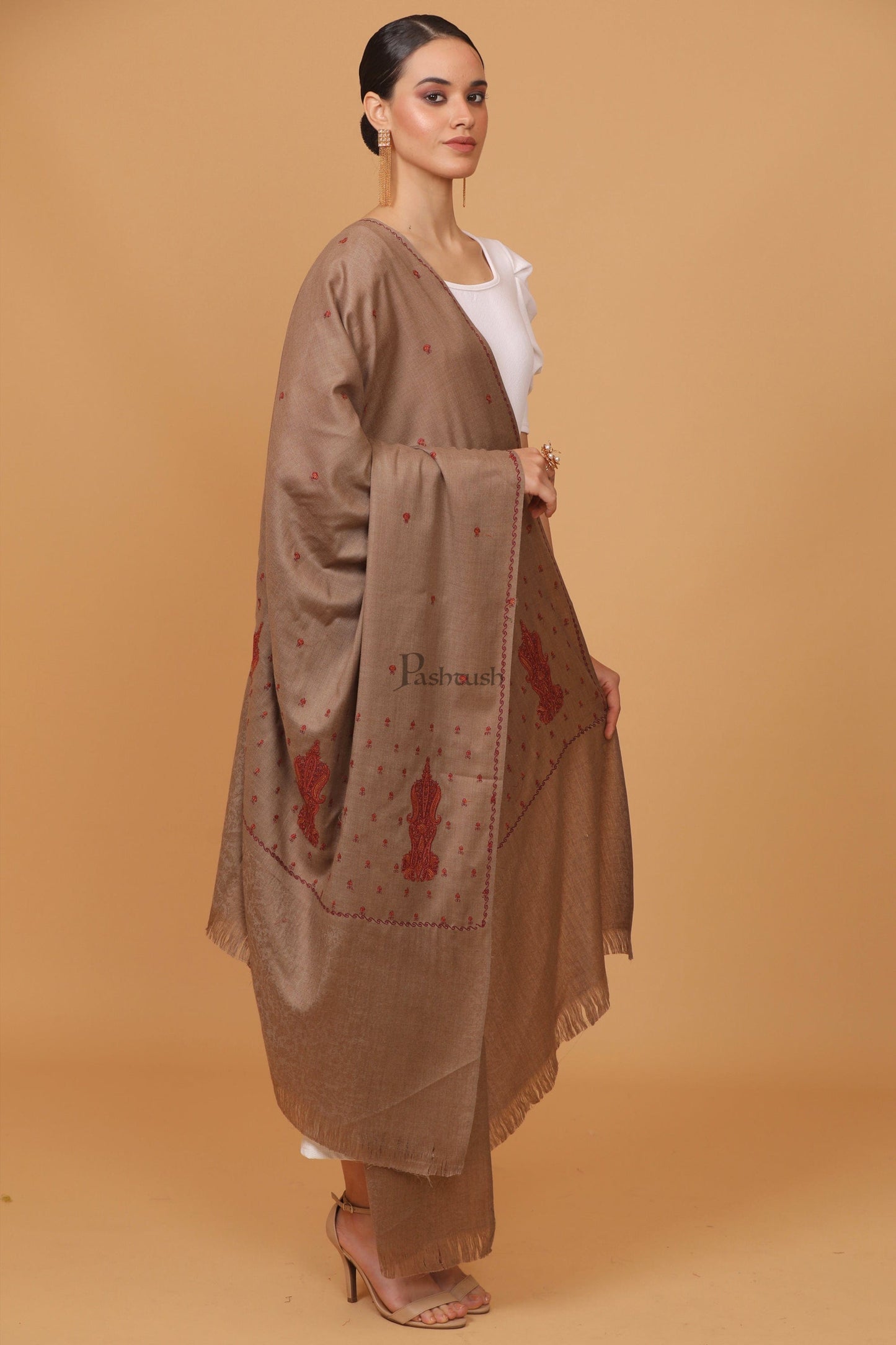Pashtush womens Fine Wool shawl, embroidery shawl Paisley self palla design, Taupe