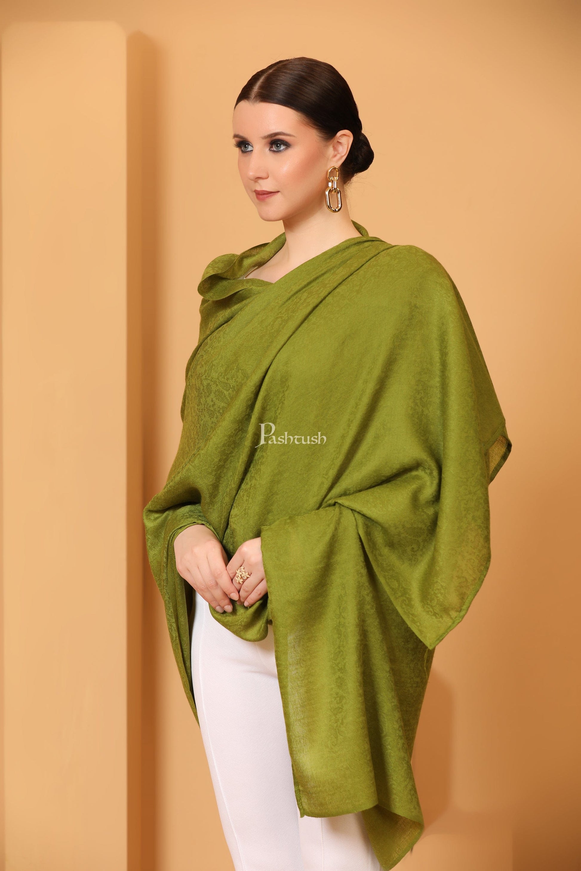 Pashtush Womens Fine Wool Shawl, Self Paisley Weave, Extra Soft, Emerald Green