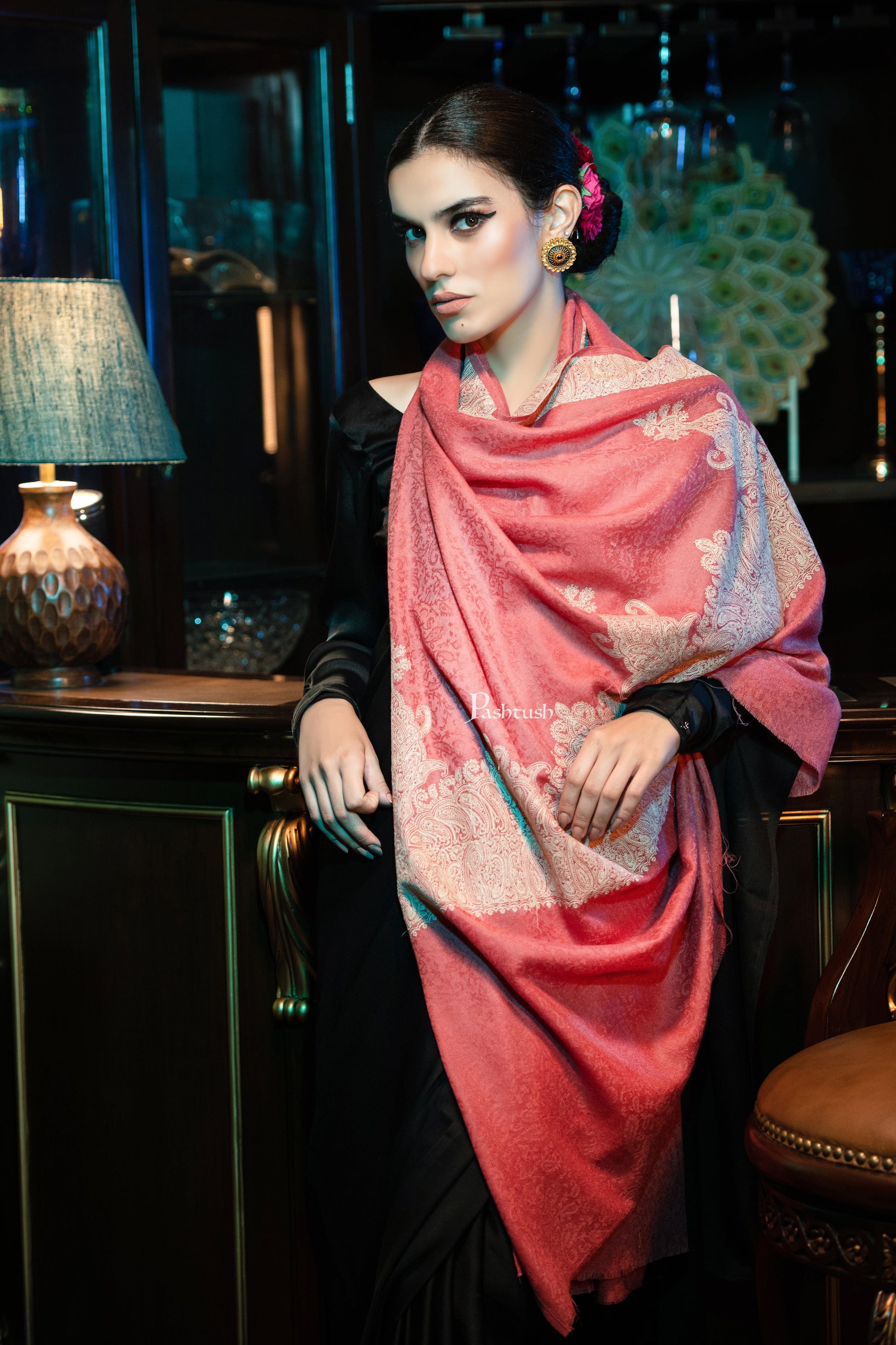 Pashtush womens Fine Wool shawl, Tone on Tone Palla Embroidery design, Peach