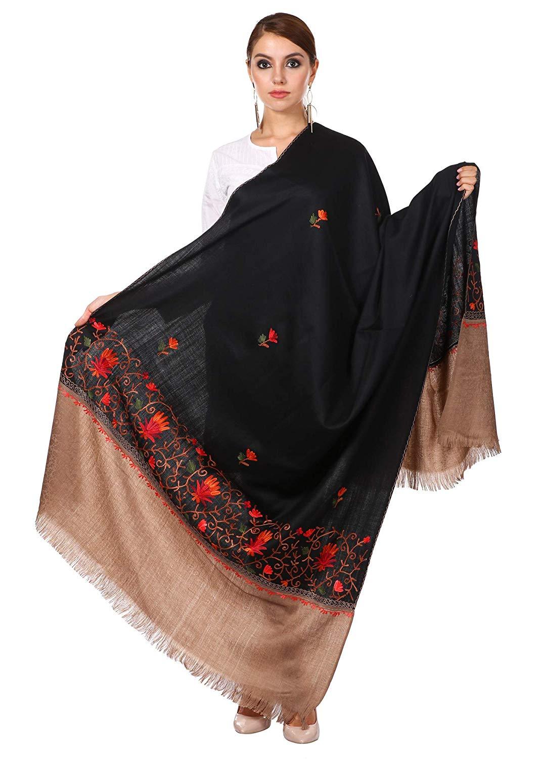 Pashtush Womens Wool Shawl With 100% Hand Embroidery, Aari Silken Thread Fine Wool Black and Beige