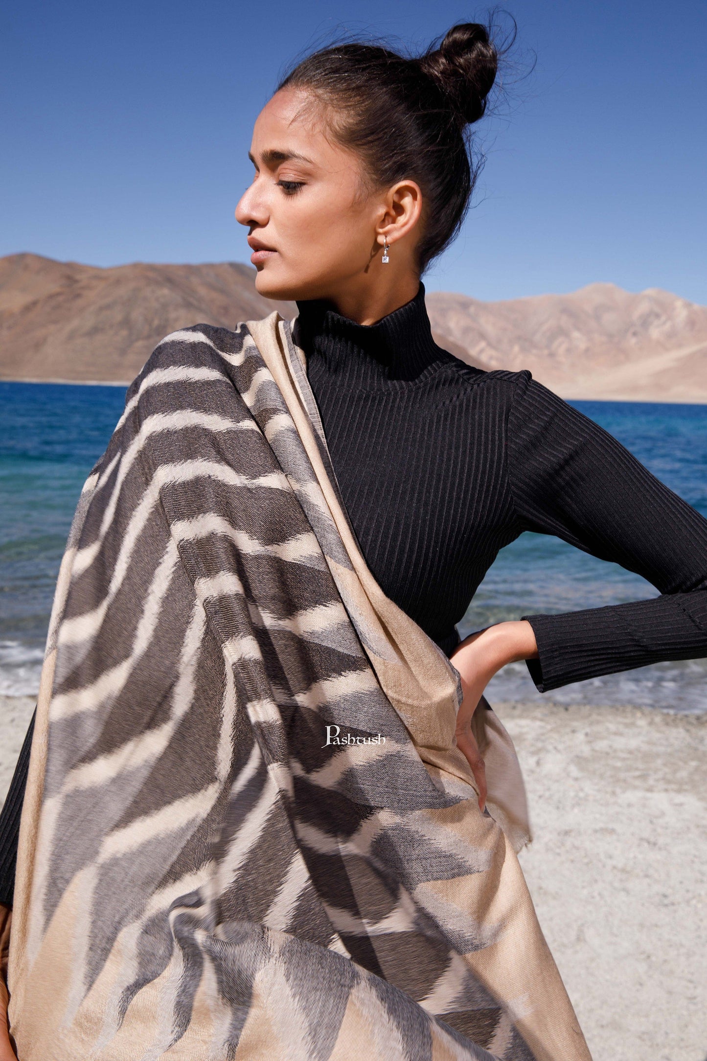 Pashtush Womens Wool Silk Stole, Woven Striped Melange Design, Beige And Black