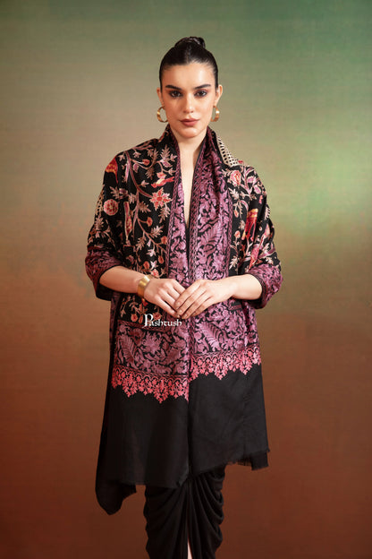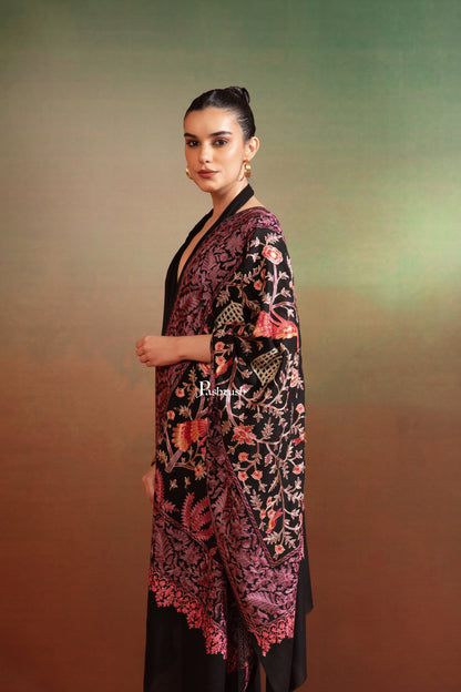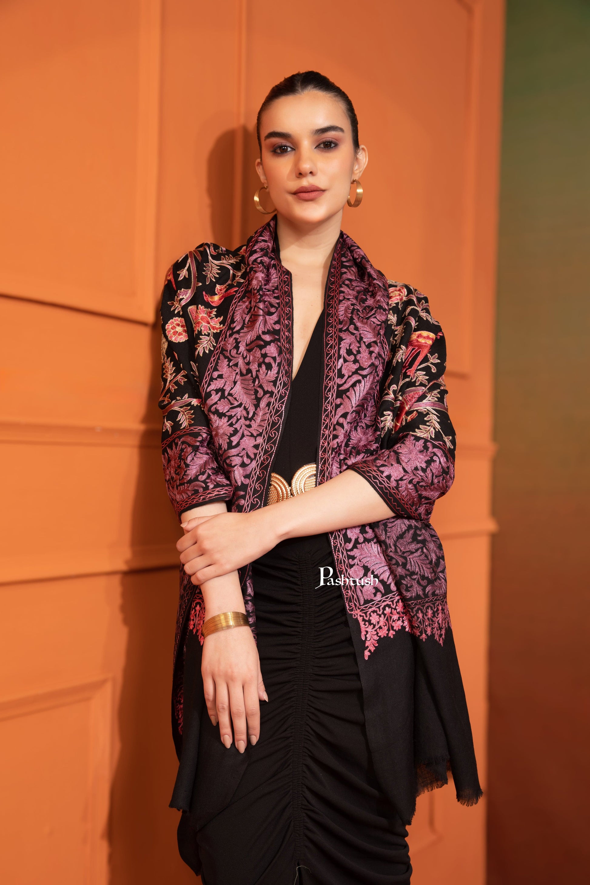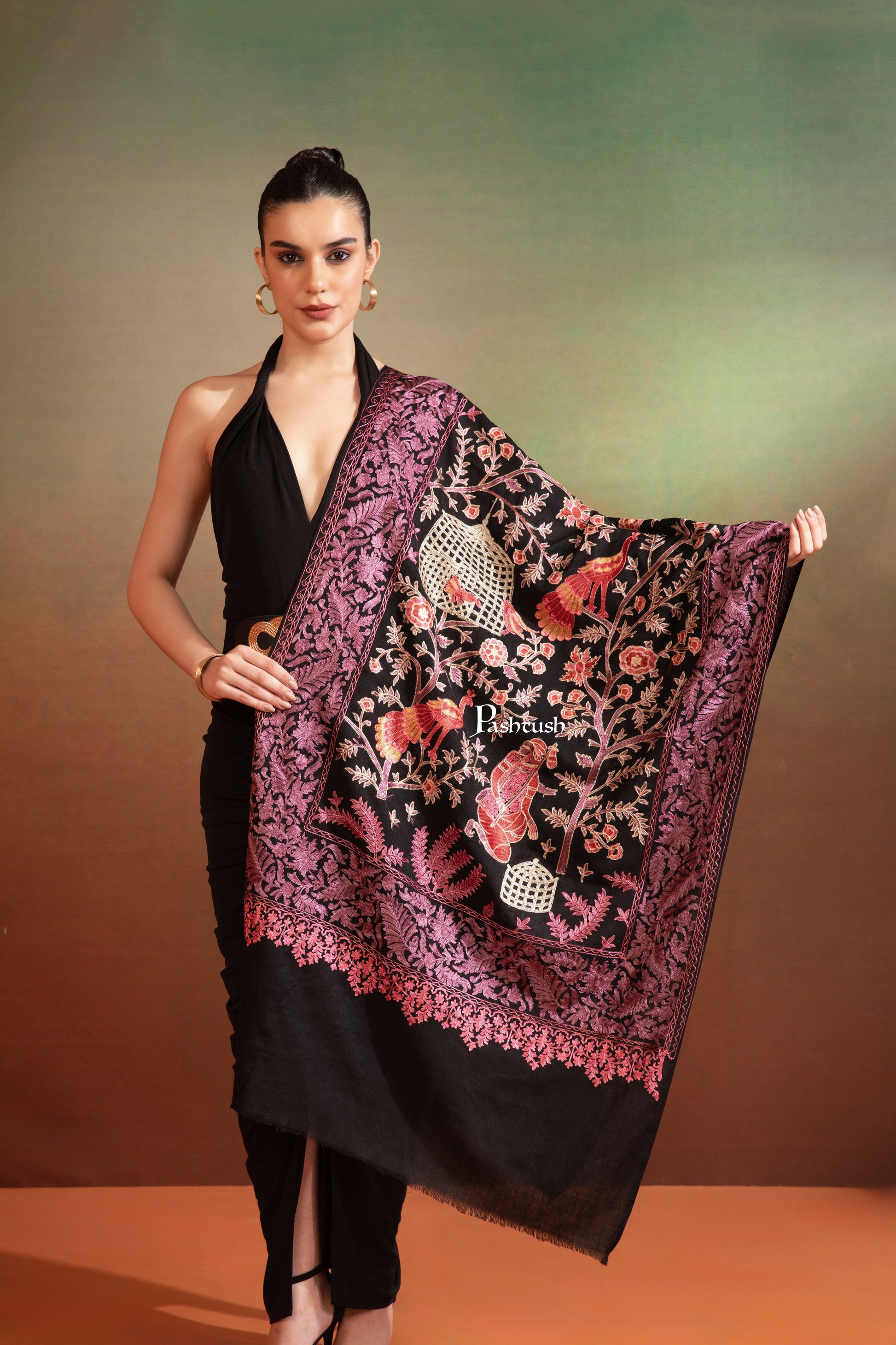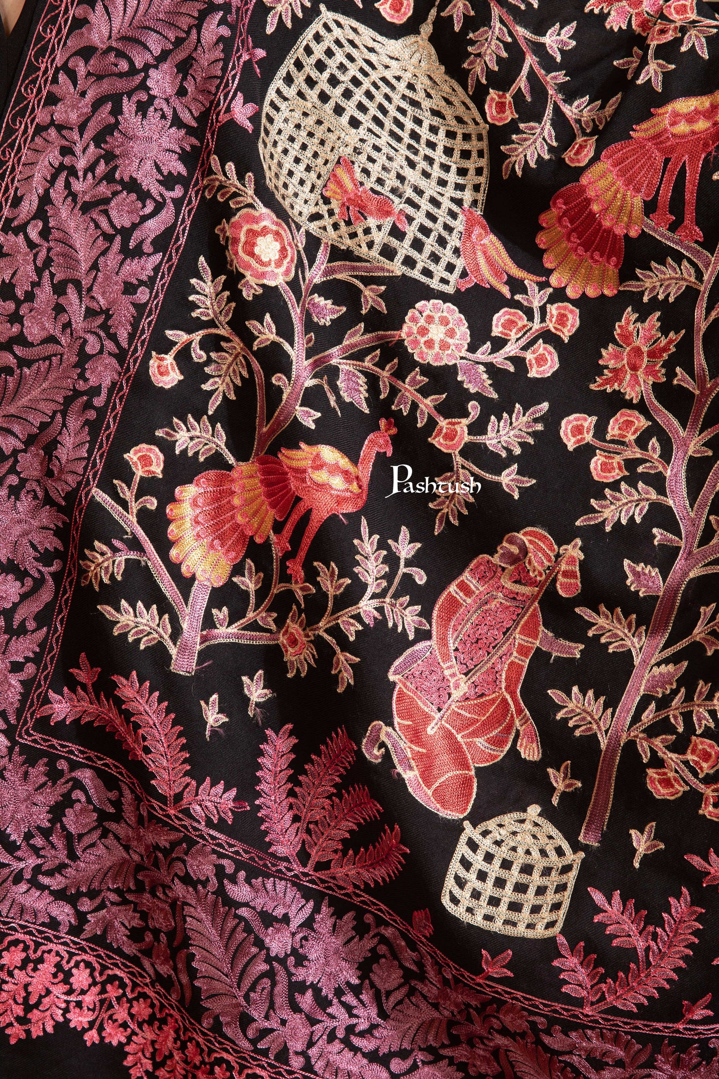 Pashtush Womens Woollen Stole, Gardens Of Paradise, Embroidery Design, Black